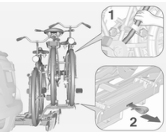 Pousser le porte-vélo (1) vers le bas et faire pivoter la poignée (2) vers l'arrière pour l'engager.